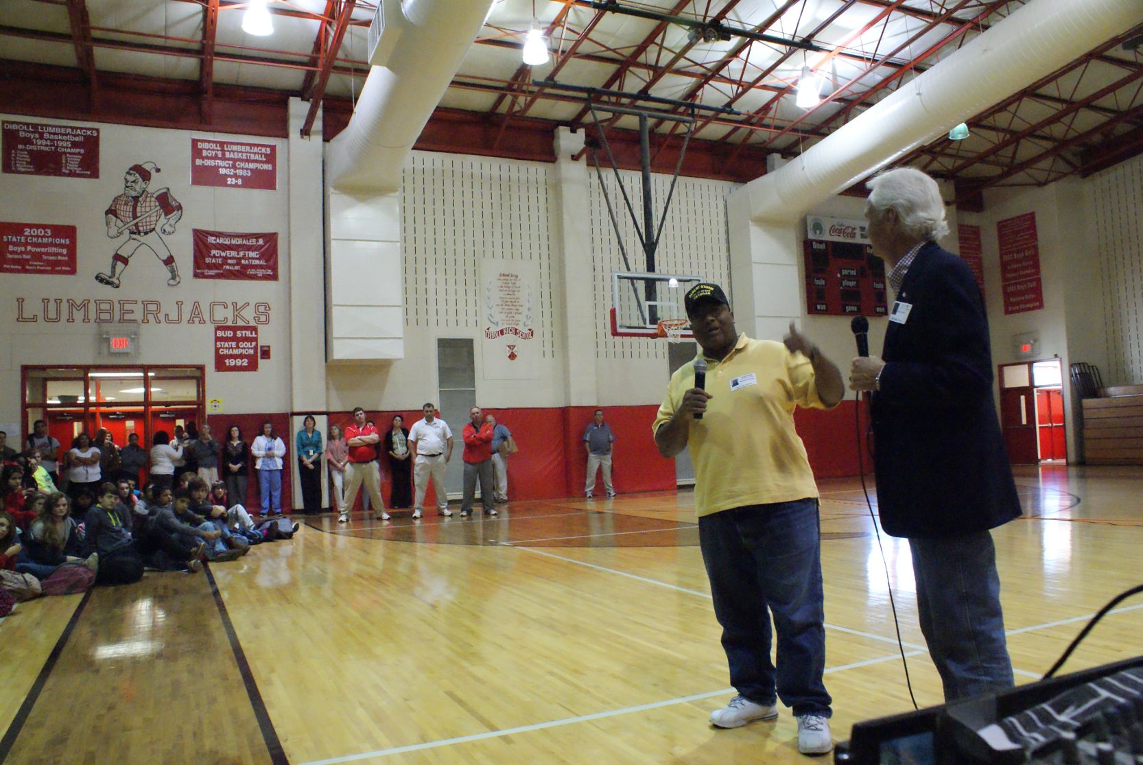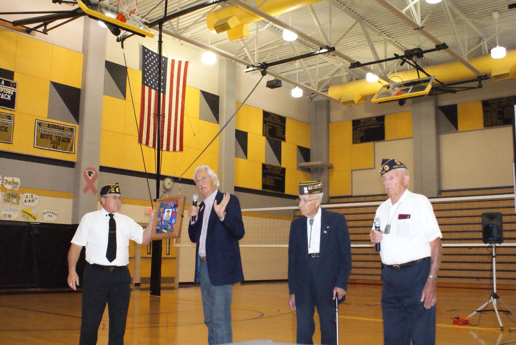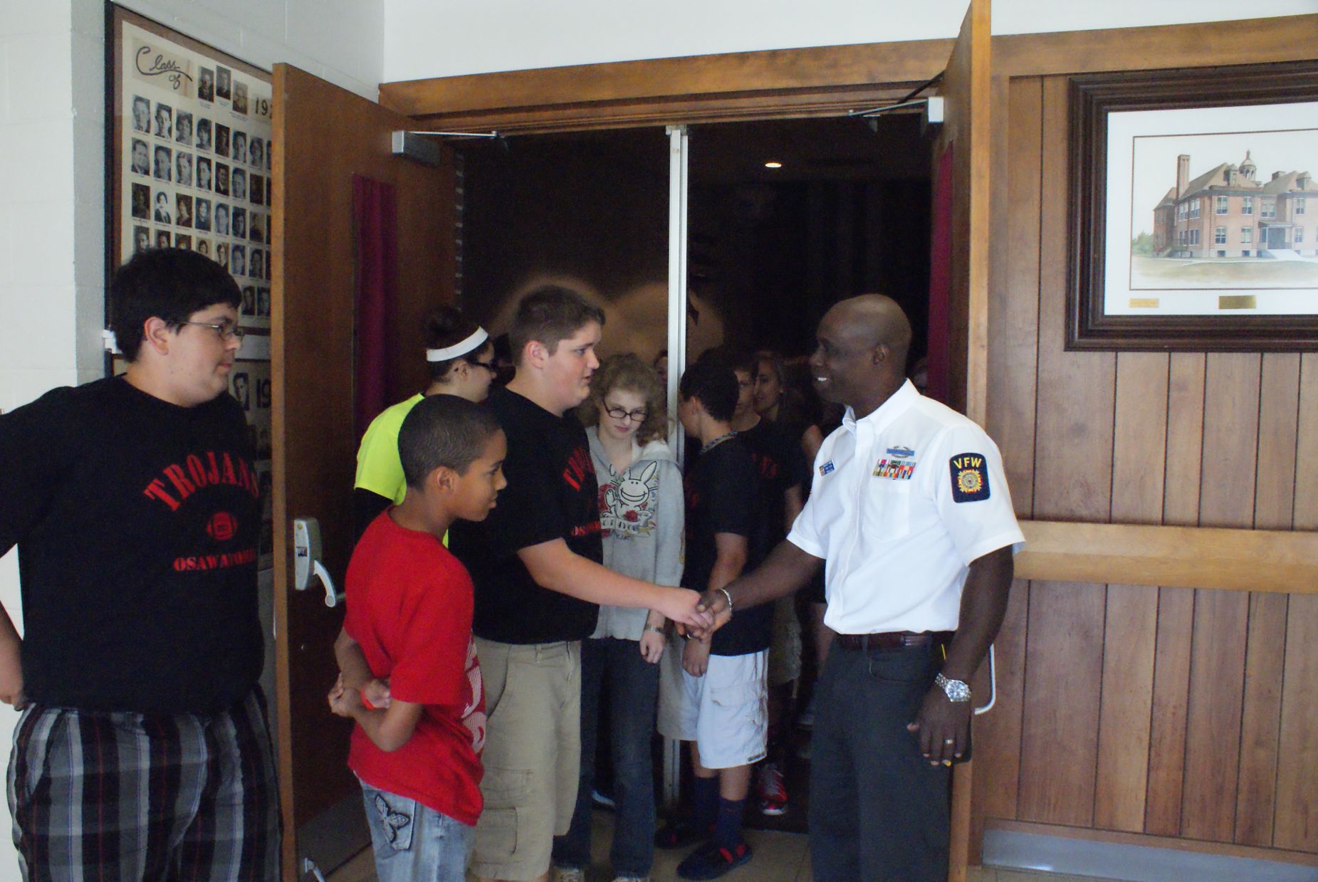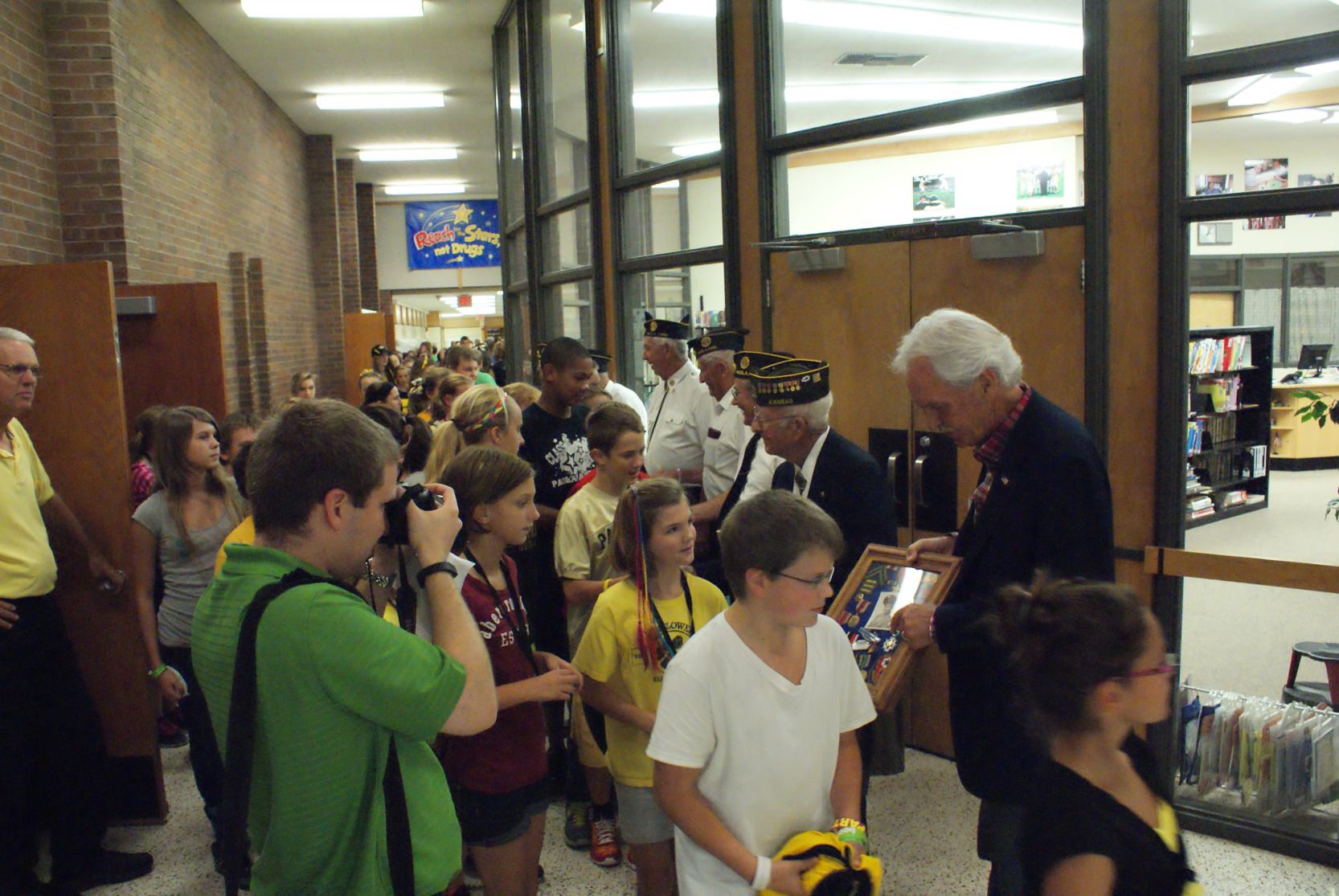 Kansas Tour Russ O'Meara, Larry Tooker, Charle Walje and Arnold Debrick in Paola, KS Paola Middle School, (Kansas) meeting the veterans Arnold Debrick, Jenifer Tooker, Charlie Walje Bradley Smith at Osawatomie School (Kansas) Greg Demko at Grand Saline, TX displaying artillery Iwo Jima survivors at 67th reunion in San Antonio Paul Merriman, Iwo Jima Purple Heart at 67th Survivors Reunion Paul Merriman