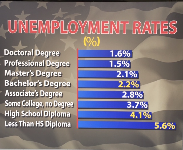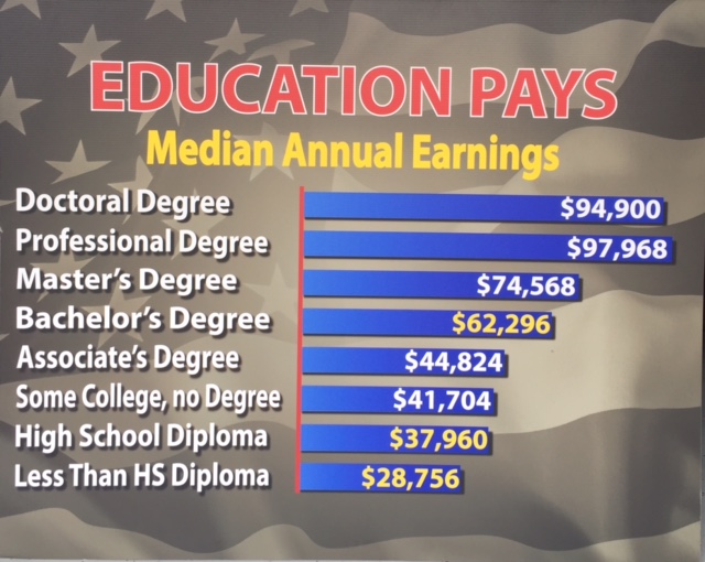 97% of teens who experience Free to Be confirm - admit - that Free to Be changed their thinking, behavior, goals, or life. Imagine 97% of America's 24,997,875 middle and high school students acquiring respect, pride and love for America and the freedom, education, opportunity, and hope she affords us all! Then, four years later, imagine the next 25 million learning this essential life lesson, then the next and the next... this is our quest... for the country, for the young people who will soon inherit it, for us all. We are striving to save a great nation... a special nation. Someone must. We found the avenue to the young people! Therein lies the answer. But we need help. If you have benefited from the hope, opportunity, education, and freedom that comes with being an American, you can be a very direct part of this quest to preserve and protect America's future. The young people who will soon manage and govern this great nation must have a solid footing in our historic legacy of freedom and patriotism if America is to continue to be the beacon of hope to the world. Below are the graphs we show the kids. It is the dramatic median incomes of age 25 and older full time, employed Americans in 2018 from the US Bureau of Labor Statistics. It will surprise you also. Students are persuaded to reconsider dropping out of school after experiencing Free to Be.